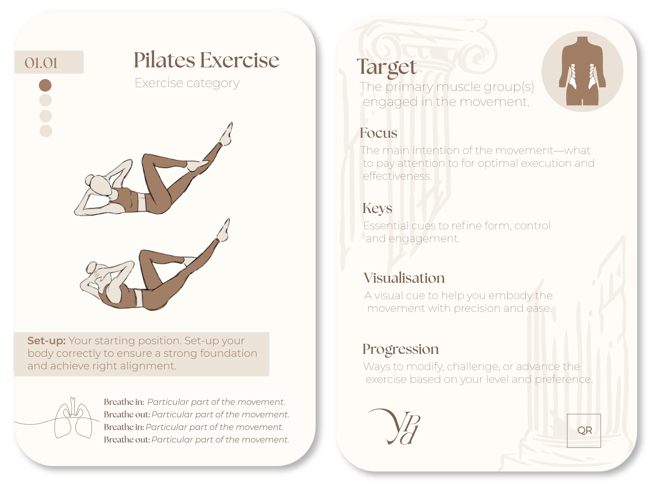 Your Pilates Deck empowers you to create your own Pilates routineātailored to your body, your needs, and your pace. Since no one knows your body better than you, we encourage a self-guided approach. With clear cues, modifications, and guidance on each card, YPD gives you the freedom to combine and adapt movements in a way that works best for you.